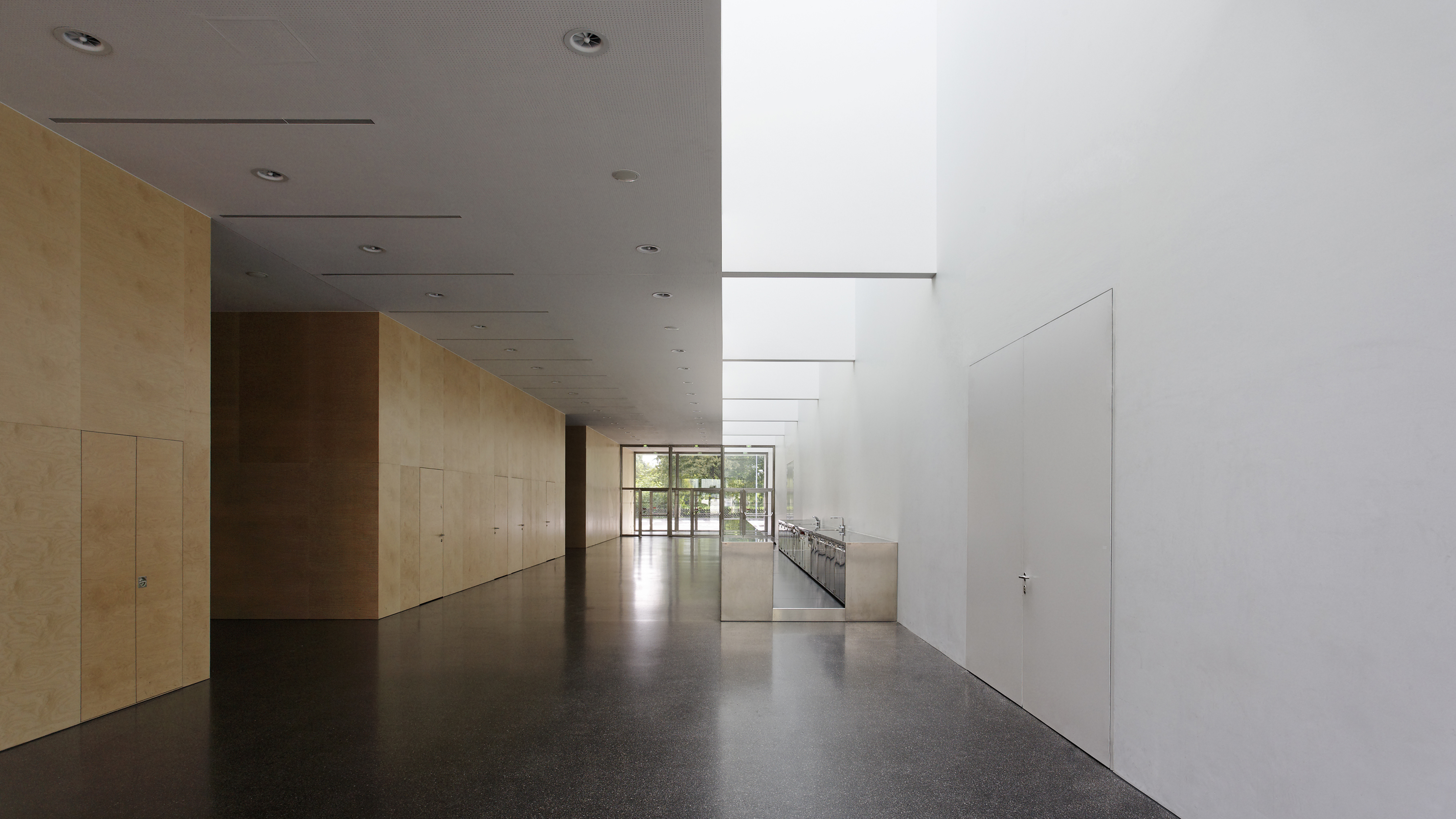 The new fair and sports hall is designed as a multifunctional hall. The foyer serves as a link between Messestrasse and the outdoors fair area as well as between the two adjacent halls. It is lighted generously by skylights. The service zone containing the appliance rooms and the sanitary rooms forms a spatial separation of the foyer and the sports hall. The design and the placement of the retractable tribunes are optimized. The variable paneling at the exterior wall ensures the flush alignment of the tribunes with the wall in both positions and hence a compact interior space. All the parts of the hall are lit by generous skylights. The wardrobes and sanitary rooms are situated in the upper floor and receive natural light from the skylight of the entrance hall by wall glazing of matted glass. The cladding and acoustic panels are made from robust birch plywood. The industrial type profile glass facade reflects the character of this urban area. By flipping the orientation of the profiles a horizontal structuring of the facade is achieved as the two bands of profile glass refract and reflect light differently.