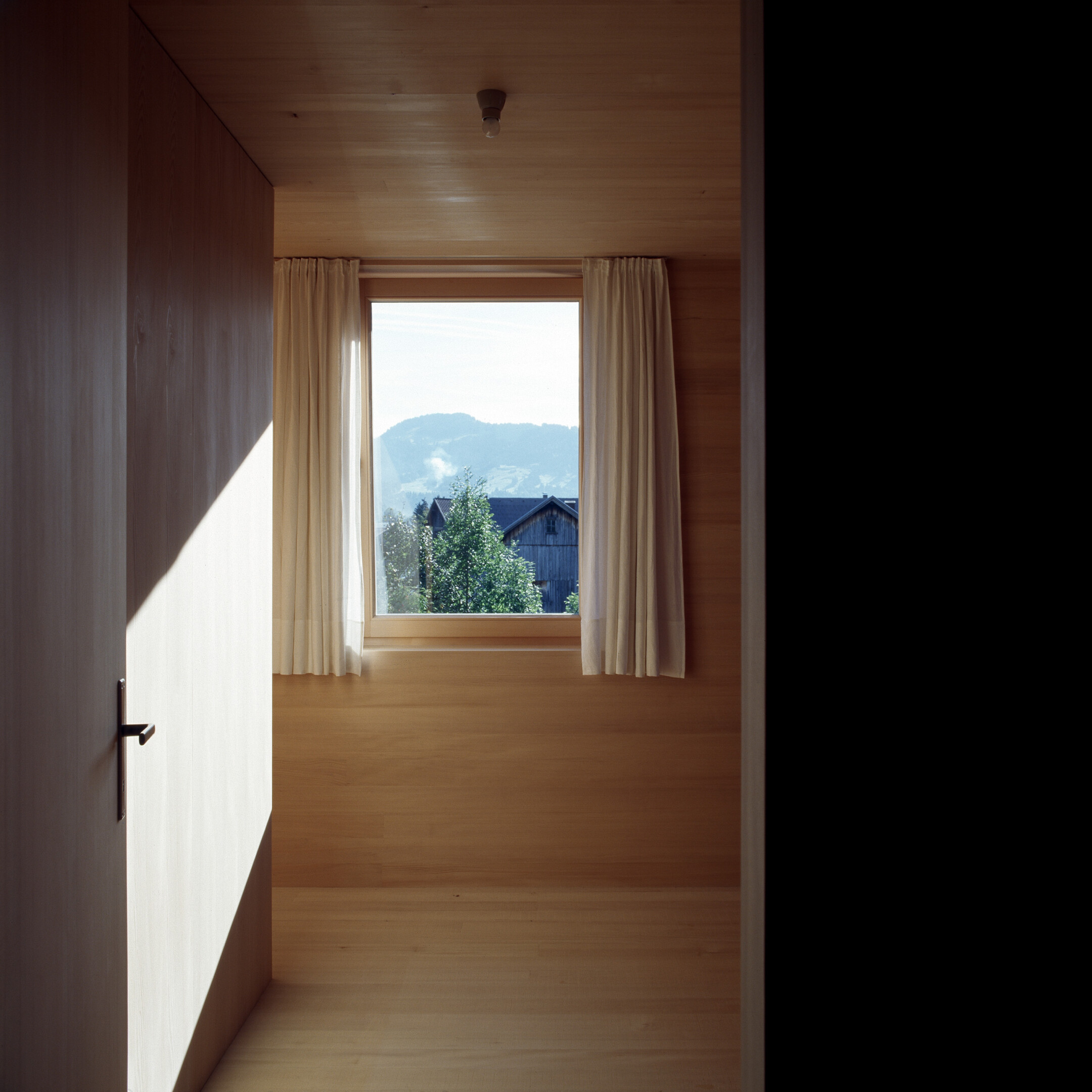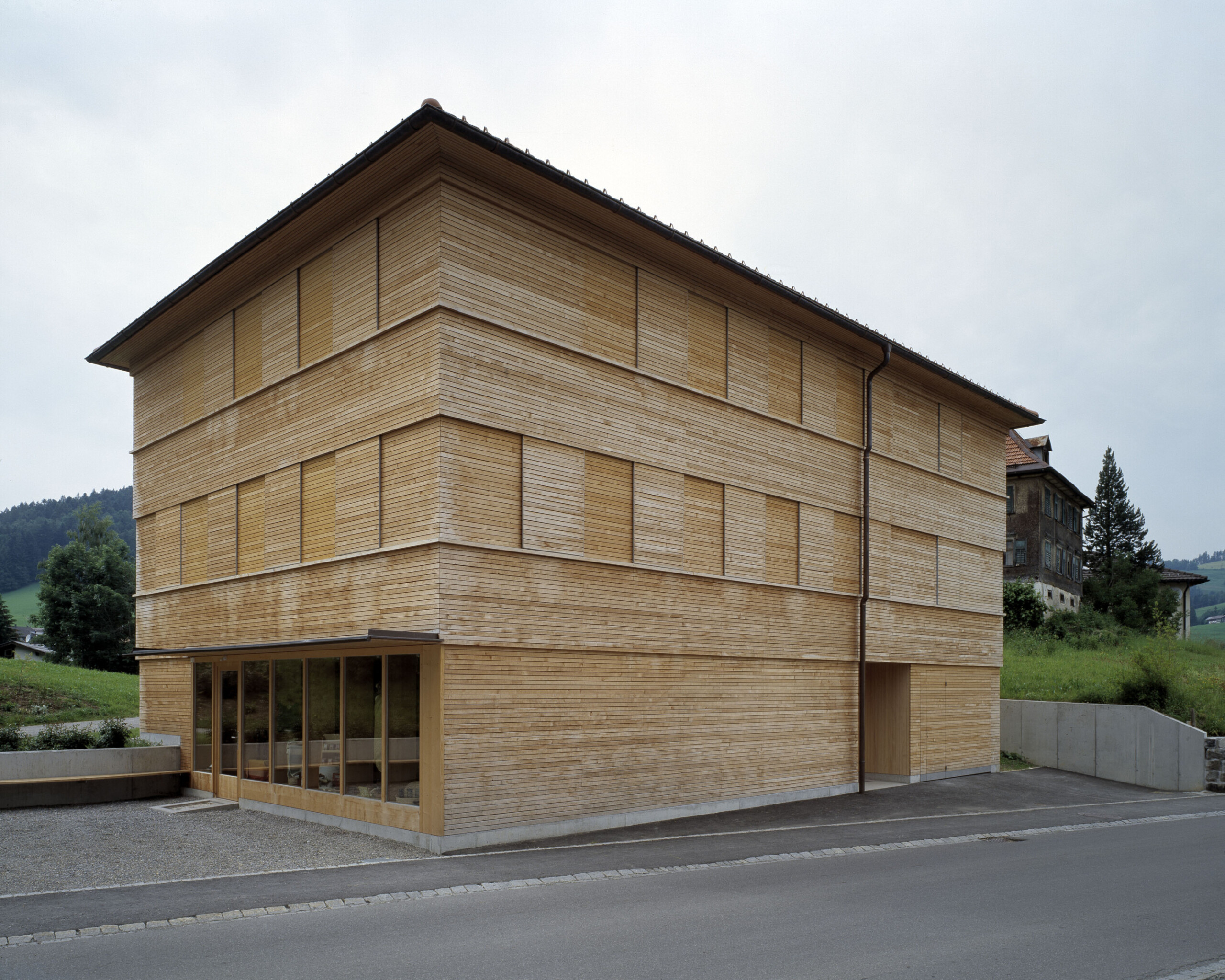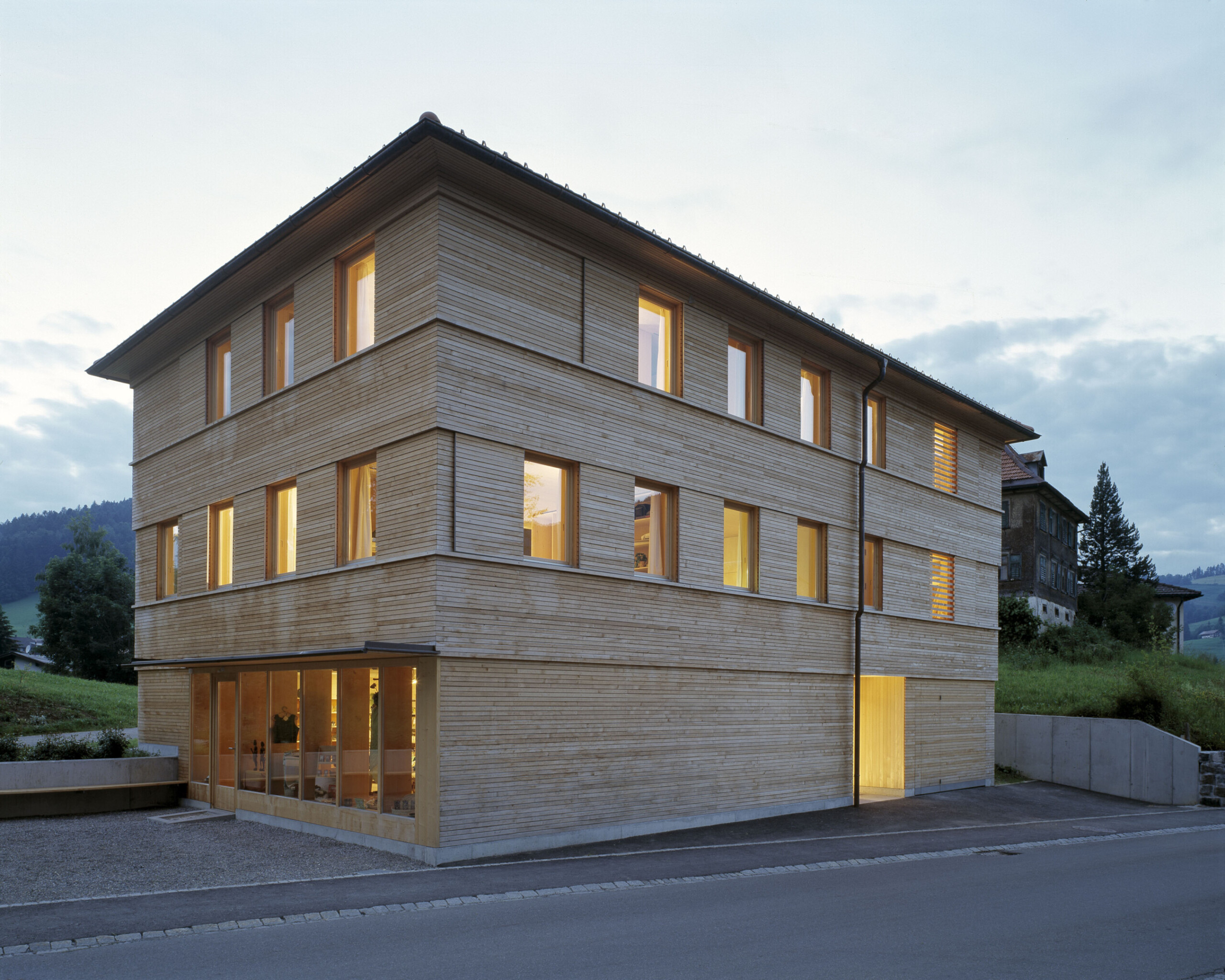 The property for the new residential house of a carpenter and his family is located right at the village square of Hittisau in the roll axis of the church next to the main road mounting in north-western direction. The building was designed as a semidetached house. The southern part of the building constitutes the living quarters of the family over two floors. The northern part of the building, separated from the other part by a staircase, can be used as an extra apartment. By simplest means, the two living quarters can be connected with each other on every floor-“several-generations-living” under one roof. On the ground floor, there are common quarters and a small store facing the village square. The three-storey wooden building takes on themes and elements of its surroundings and interprets them in a new context. The bulge of each storey as well as the protrusive, passing-through windowsills give the facade a constructive weather-protection. Simple details and the exclusive use of massive wood as building material coin the new building house. In accordance with the regional building tradition untreated domestic white fir is used exclusively for the walls, ceilings and floors. The degree of openness of the house can be determined easily and simply by adjustment of the blinds. The house is not meant to be flashy. Its appearance blends in with the surroundings inconspicuously and only catches the eye of the beholder at second glance.