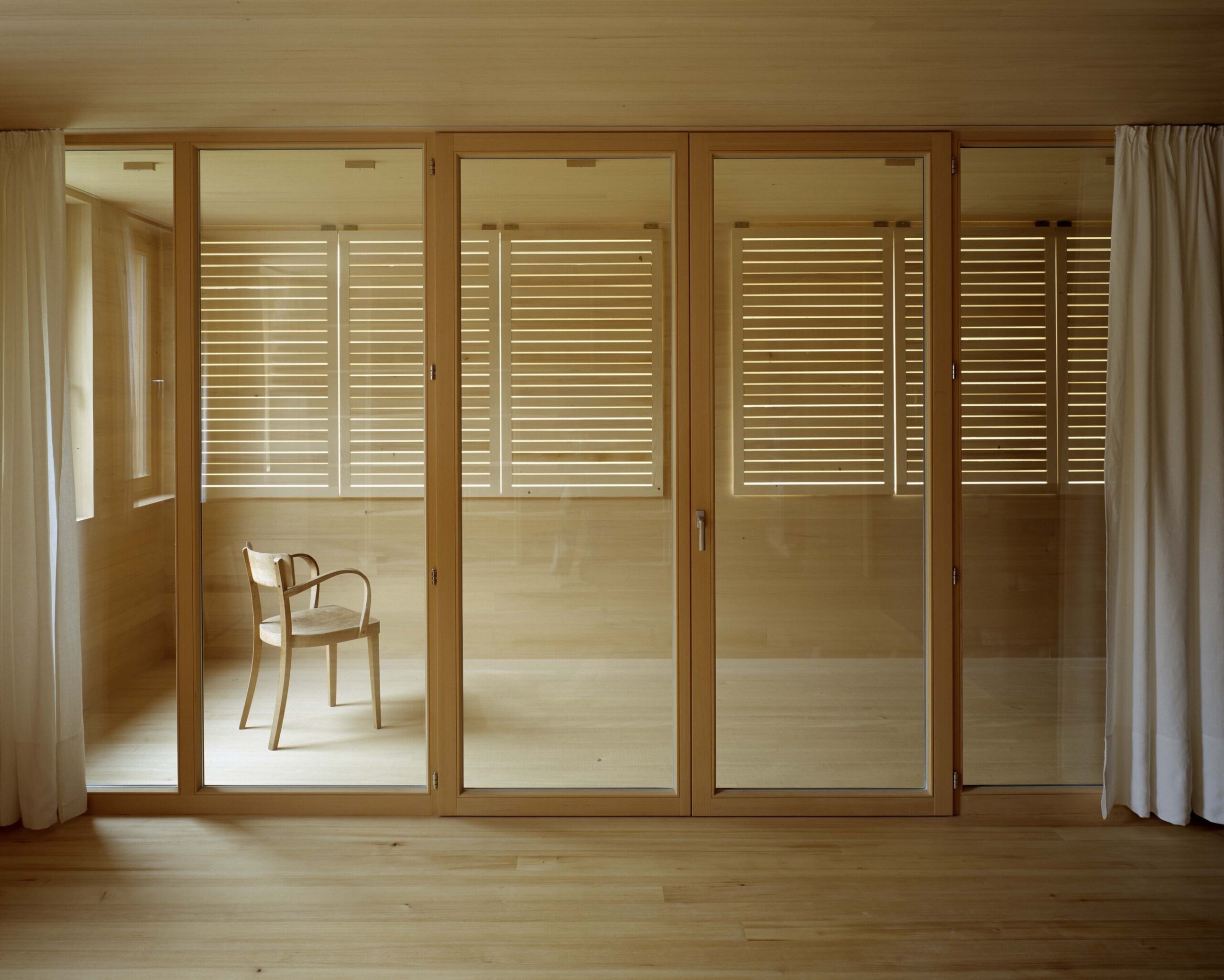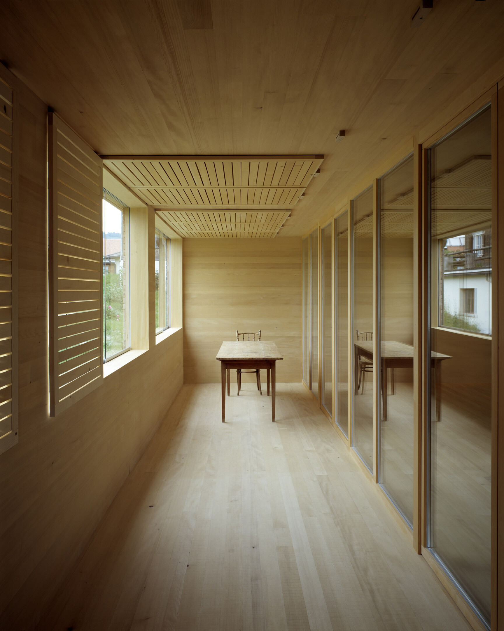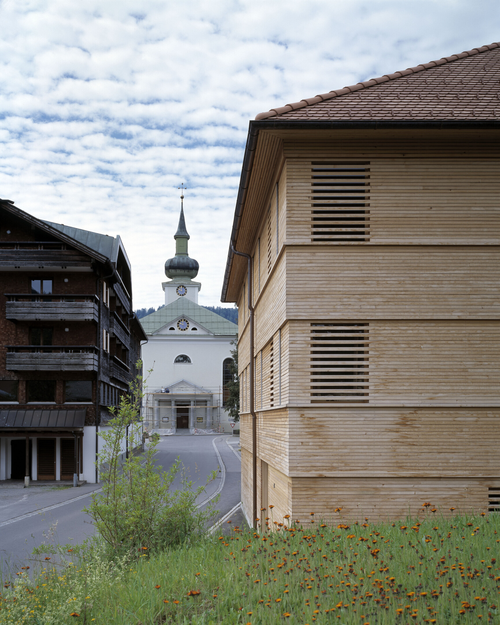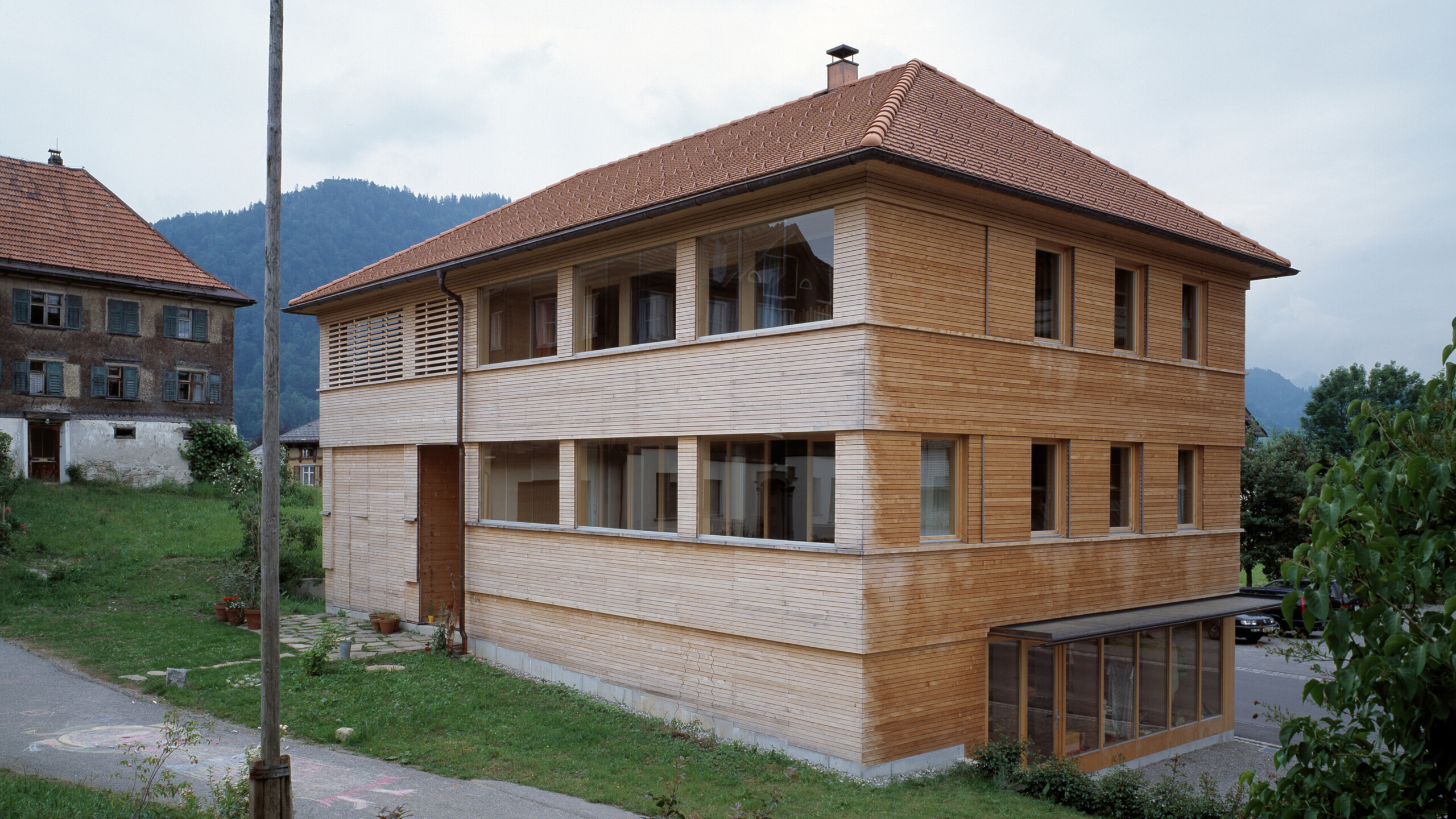 The property for the new residential house of a carpenter and his family is located right at the village square of Hittisau in the roll axis of the church next to the main road mounting in north-western direction. The building was designed as a semidetached house. The southern part of the building constitutes the living quarters of the family over two floors. The northern part of the building, separated from the other part by a staircase, can be used as an extra apartment. By simplest means, the two living quarters can be connected with each other on every floor-“several-generations-living” under one roof. On the ground floor, there are common quarters and a small store facing the village square. The three-storey wooden building takes on themes and elements of its surroundings and interprets them in a new context. The bulge of each storey as well as the protrusive, passing-through windowsills give the facade a constructive weather-protection. Simple details and the exclusive use of massive wood as building material coin the new building house. In accordance with the regional building tradition untreated domestic white fir is used exclusively for the walls, ceilings and floors. The degree of openness of the house can be determined easily and simply by adjustment of the blinds. The house is not meant to be flashy. Its appearance blends in with the surroundings inconspicuously and only catches the eye of the beholder at second glance.