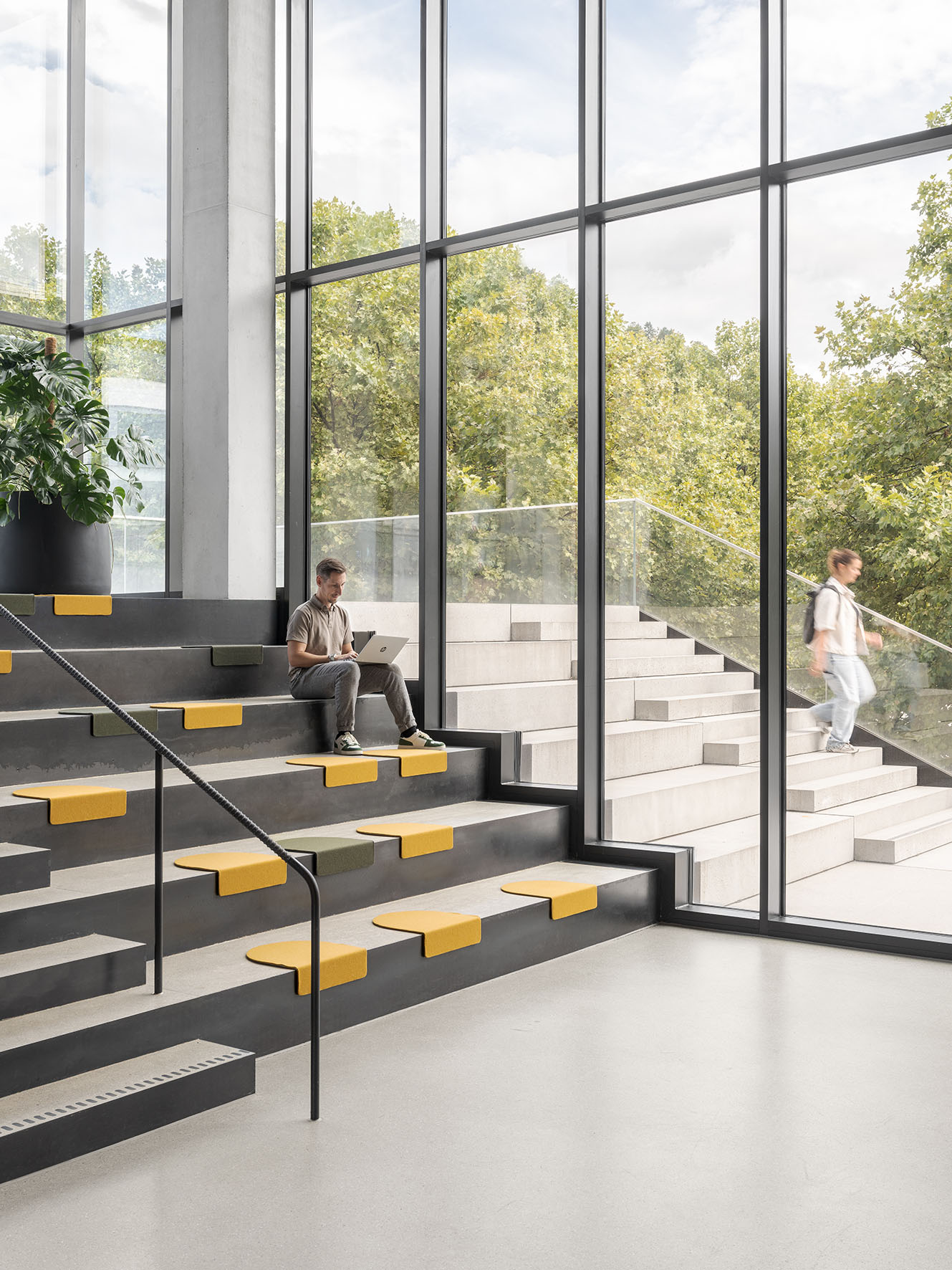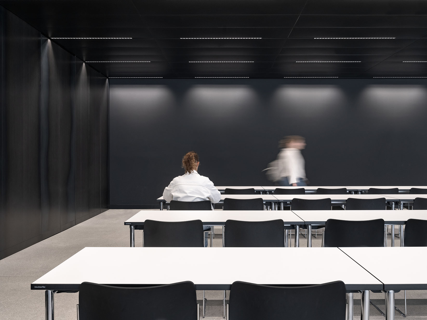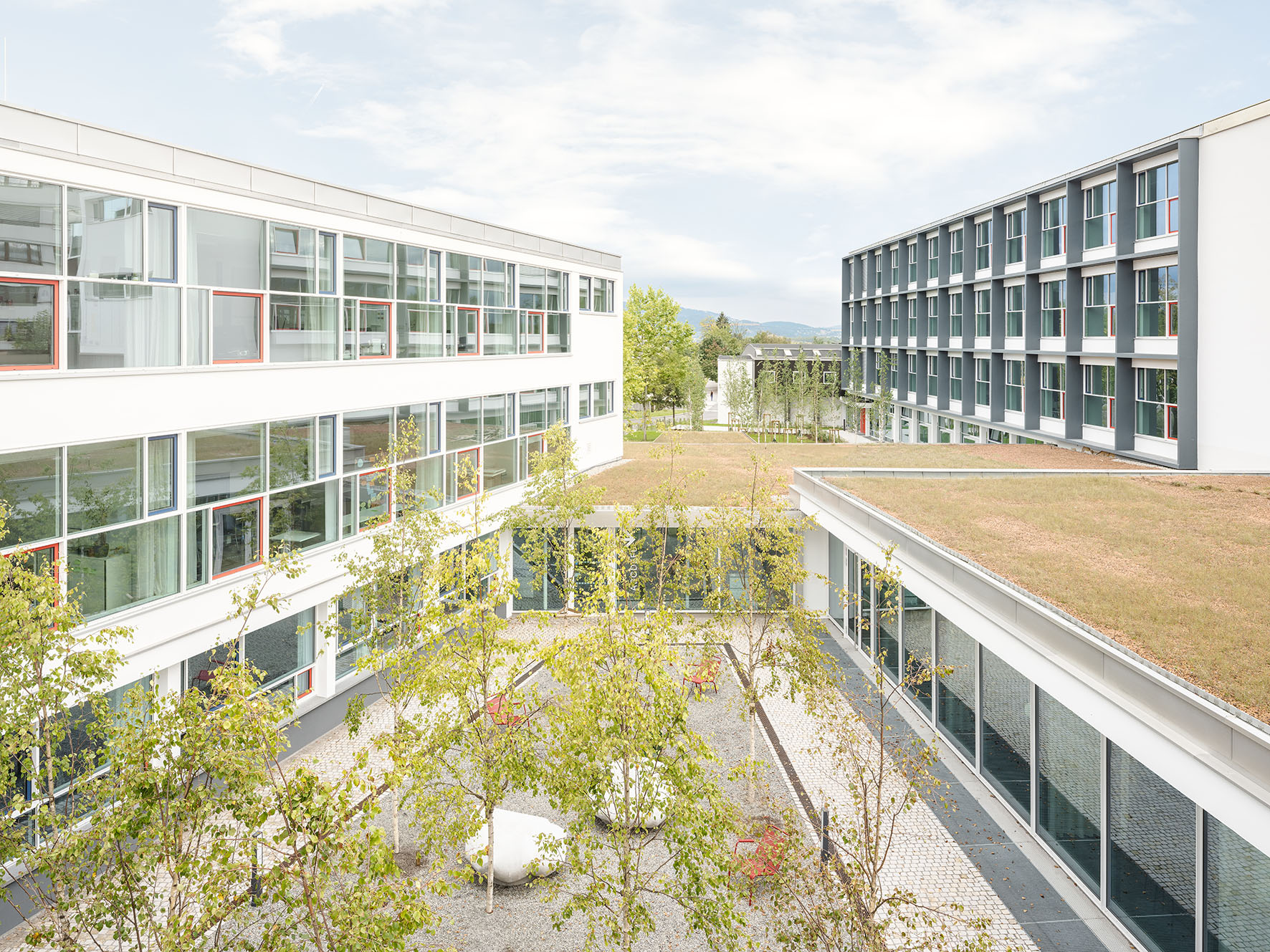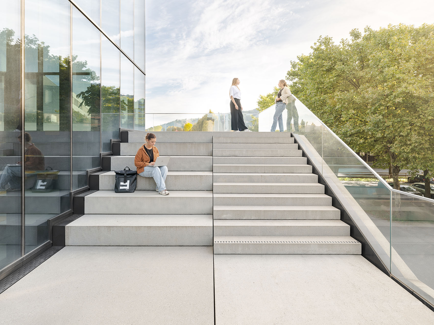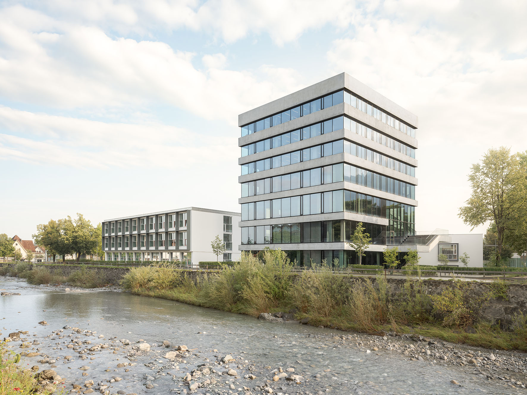 Der Campus der FH Vorarlberg befindet sich nahe dem Stadtzentrum und besteht aus drei Standorten unterschiedlicher Entstehungszeiten mit jeweils individuellem Ausdruck und Gepräge. Im Sinne einer Gesamtkonzeption sollen die drei Standorte durch Verdichtung gestärkt und über qualitätsvolle Außenraumsequenzen gut miteinander verknüpft zu einem lebenswerten Hochschulcampus weiterentwickelt werden. Das 1956 entlang der Dornbirner Ache entwickelte Ensemble Achstraße ist geprägt von einer Komposition unterschiedlich geformter Bauteile und soll saniert und erweitert werden. Die einzelnen Hauptvolumen unterschiedlicher Höhe stehen in einem spannungsvollen Verhältnis zueinander, sie werden durch niedrige Verbindungsbauteile zu einer Baufigur verknüpft und entwickeln einen Ort hoher architektonischer Dichte mit wertvollen und einzigartigen baulichen Zeitzeugen. Aus dem Kompositionsthema der Bestandsbauten unterschiedlicher Höhe wird östlich des Bauteiles E und in zurückversetzter Stellung ein siebengeschossiges turmartiges Volumen entwickelt, welches die sanften Höhenbewegungen des Ensembles weiterschreibt und mit den Hochpunkten des Quartieres in Beziehung tritt. Der ruhig gestaltete Neubau reagiert dezent und ausgewogen auf die bestehenden baulichen Strukturen und entwickelt allseitig gut proportionierte Außenräume. Setzung, Ausdehnung und Höhe des kleinen Turmes schaffen neben einer guten Präsenz auch einen vorläufigen Quartiersabschluss und lassen durch maximale Freistellung weitere bauliche Entwicklungen des Campus Richtung Osten ohne Strukturfestlegungen zu. Zur besseren Vernetzung der Standorte wird der Bauteil C zu einem verbindenden Gelenk umgestaltet. Mit der Einrichtung einer Cafeteria entwickelt er sich zu einem Treffpunkt, als zentrale Drehscheibe unterstützt er die Durchwegung im Gesamtensemble und verknüpft sämtliche Beziehungen sowohl zwischen Foyer und Bibliothek als auch zwischen Campus-Platz und Campus-Hof. Die derzeitige „Hintereingang‐Situation“ wird aufgelöst, eine neue elegante Treppen- und Rampenanlage überwindet einladend und barrierefrei die Höhendifferenz zwischen Platz und offen gestalteter Cafeteria. Nach genauer Analyse und Abwägung diverser Kriterien wird für die Sanierung der Bestandsbauten ein Konzept vorgeschlagen, welches mit minimalem Aufwand die außerordentlich hohe Qualität zu erhalten imstande ist. Ein ausgewogenes Freiraumkonzept mit Campus-Garten, Campus-Platz und Campus-Hof ergänzt die baulichen Maßnahmen zu einer architektonischen Einheit.