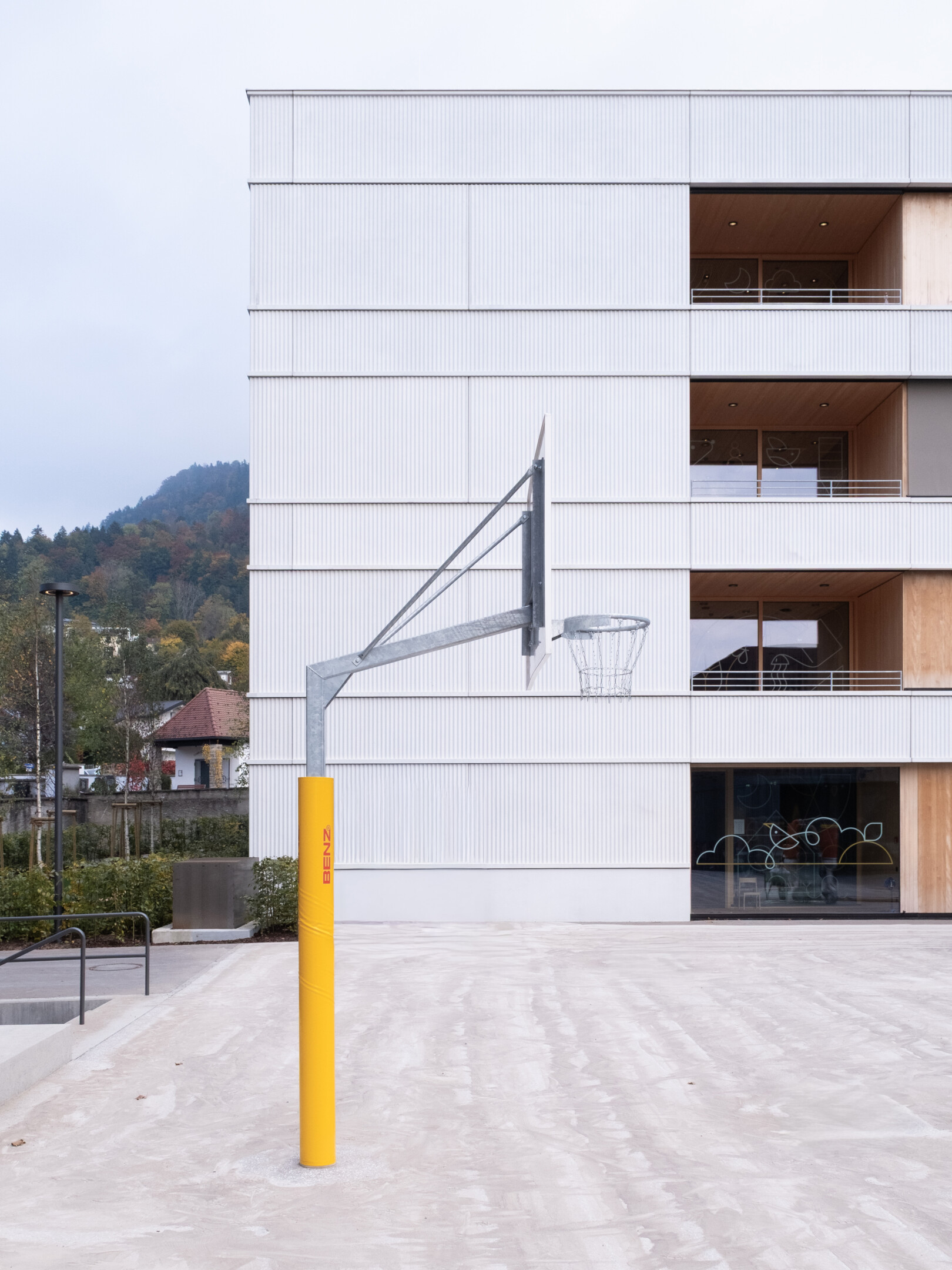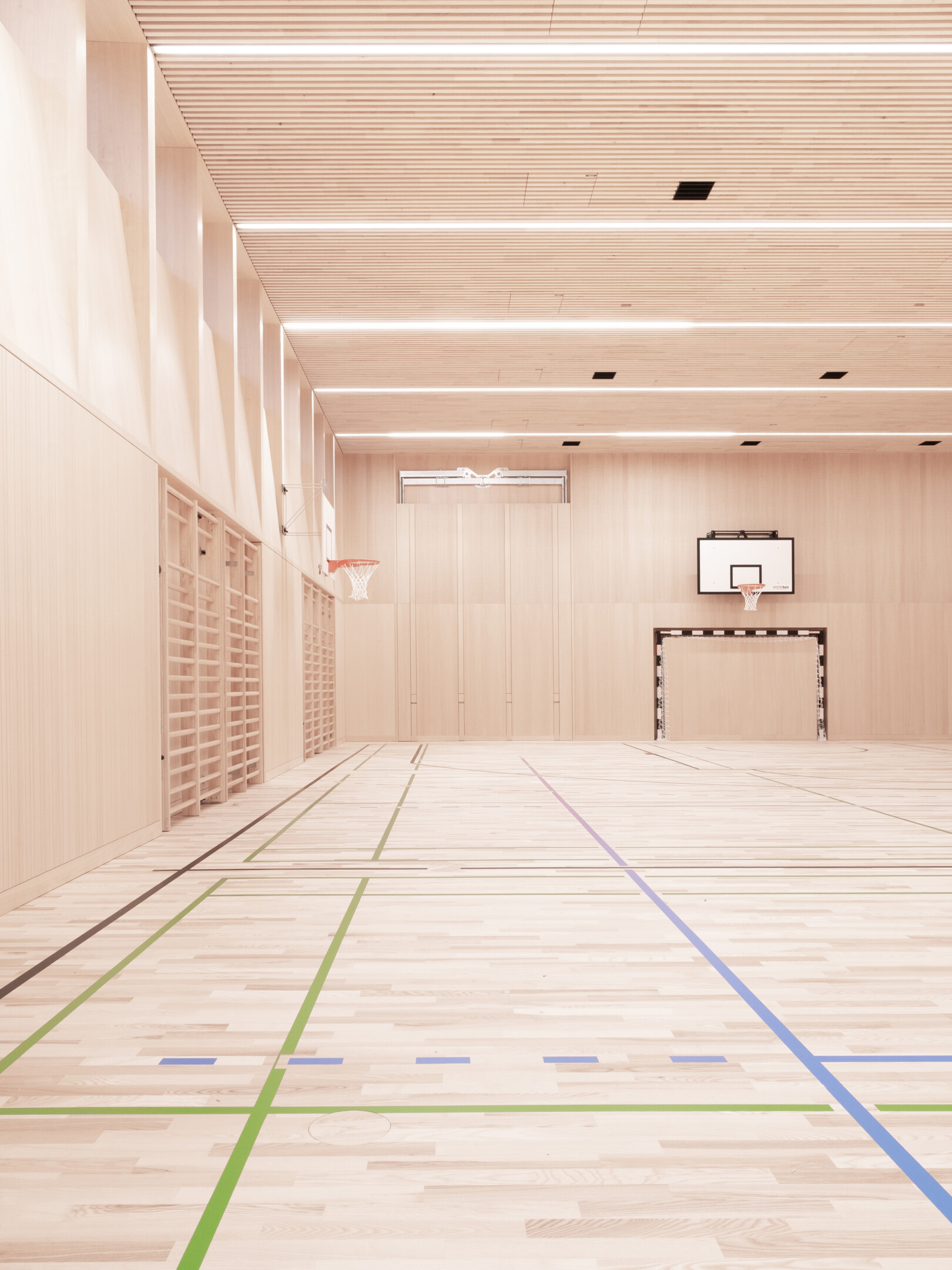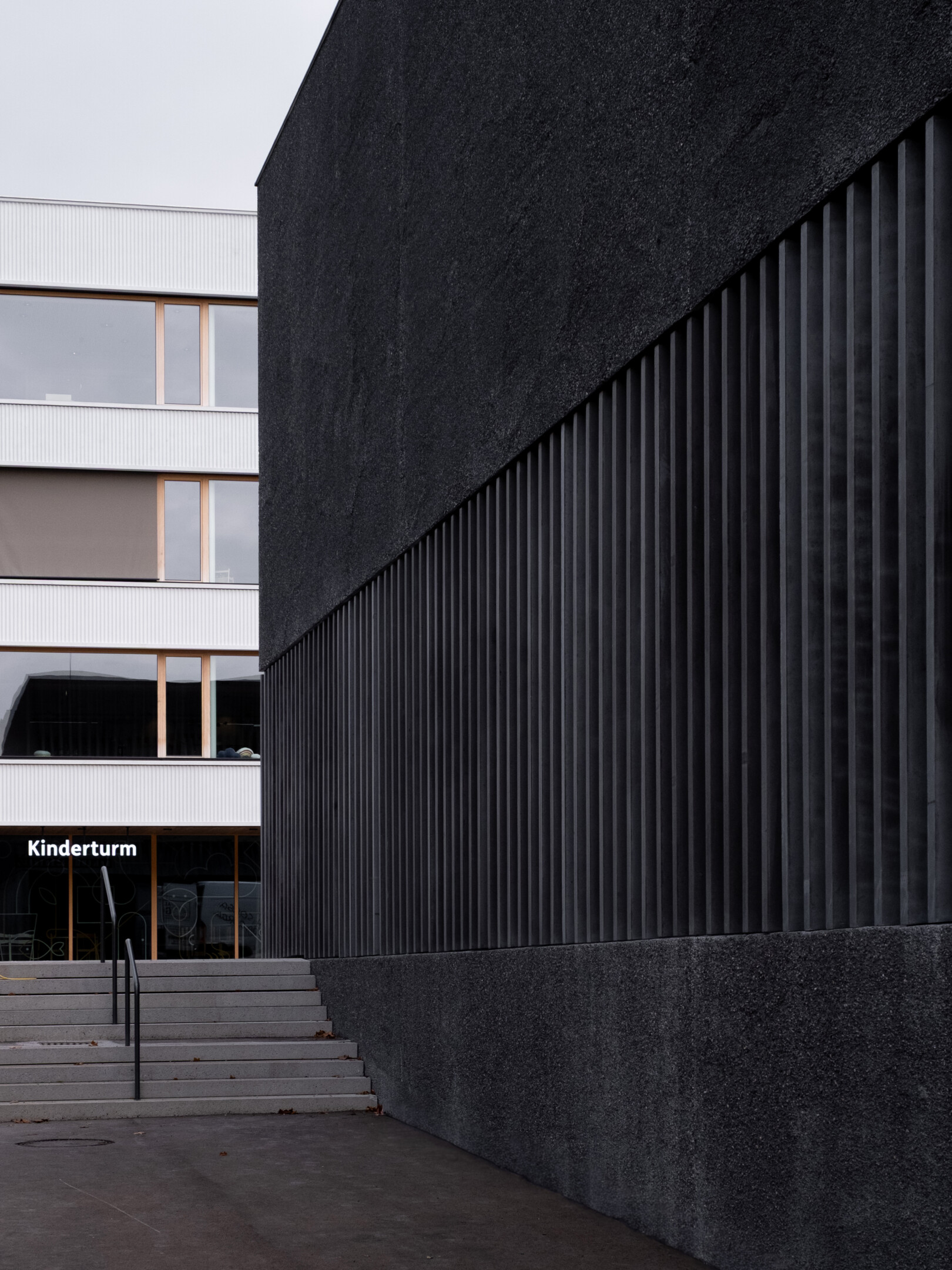 Zwei neue Baukörper mit quadratischer Grundform und unterschiedlicher Höhenentwicklung ergänzen die bestehenden Strukturen aus Kirche, Fachschule und Volksschule in einer ausgewogenen Komposition zu einem neuen baulichen Ensemble. Die präzisen Setzungen des Kinderhauses sowie des Turn- und Veranstaltungshauses entwickeln differenzierte, gut proportionierte Außenräume und einen räumlich gefassten Dorfplatz als neue Quartiersmitte. Die beiden quadratischen Volumen fungieren jeweils als ordnende Elemente im heterogenen Umfeld. Die versetzte Stellung resultiert aus direkten Blickbeziehungen, Adressbildungen der einzelnen Baukörper sowie großzügigen Zugangs- und Erschließungsachsen von der Haselstauderstraße aus. Das zweigeschossige Turn- und Veranstaltungsgebäude wird unmittelbar an der Haselstauderstraße positioniert, es wirkt straßenraumbildend und schafft Präsenz im öffentlichen Raum, es tritt in Dialog mit den gegenüberliegenden baulichen Strukturen und vermittelt mit seiner Strahlkraft die Wirksamkeit als wichtiges öffentliches Gebäude. Durch seine Stellung zwischen Straße und Dorfplatz fungiert es als Gelenksbau und bespielt gleichzeitig auch beide Situationen. Der Punktbau des Kinderhauses bildet den nordöstlichen Abschluss des neuen Dorfplatzes und fungiert ebenfalls als Gelenk zum angrenzenden Spielplatz. Durch seine viergeschossige Organisation wird sein Fußabdruck minimiert und die Platzfläche vergrößert. Es entstehen spannungsvollere Dialoge. Differenzierte Höhenentwicklungen und Maßstäblichkeiten unterstützen die Lebendigkeit der Konzeption.